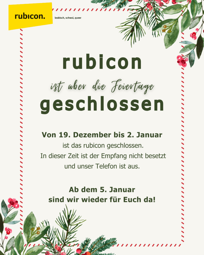 Vom 19. Dezember 2024 bis zum 2. Janaur 2026 ist das rubicon geschlossen.